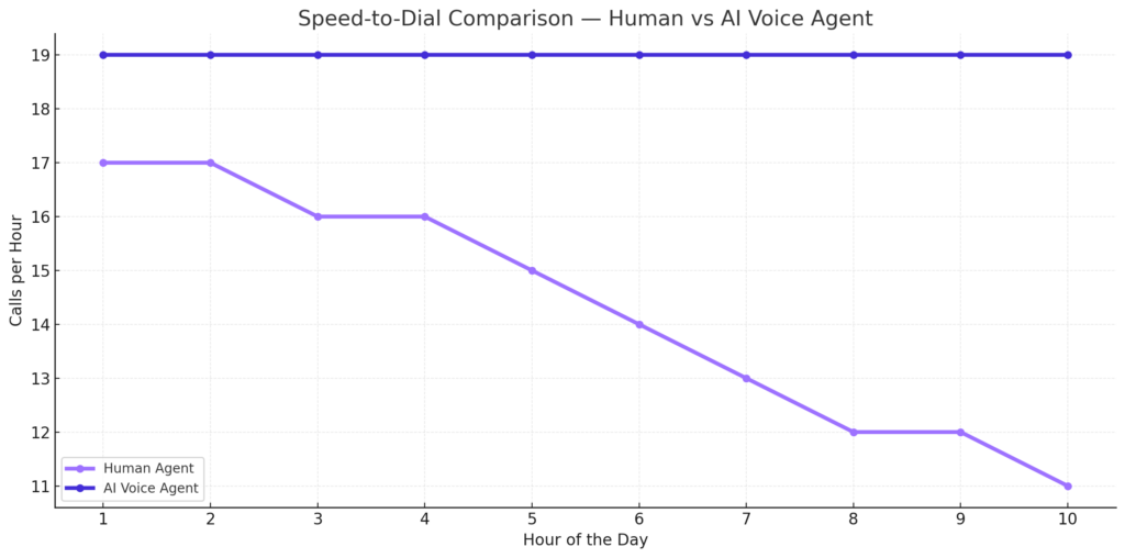 Humans started strong fuelled by coffee at 15–18 calls/hour, then they fade to 10–12 by mid-afternoon. The AI agent just stays chill and steady at 18–20 all day.